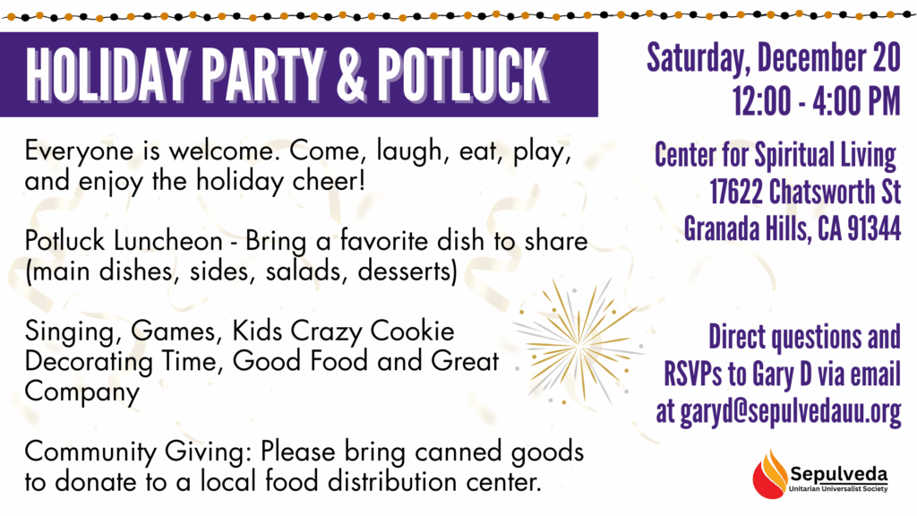 - Potluck luncheon – Bring a favorite dish to share – main dishes, sides, salads, desserts