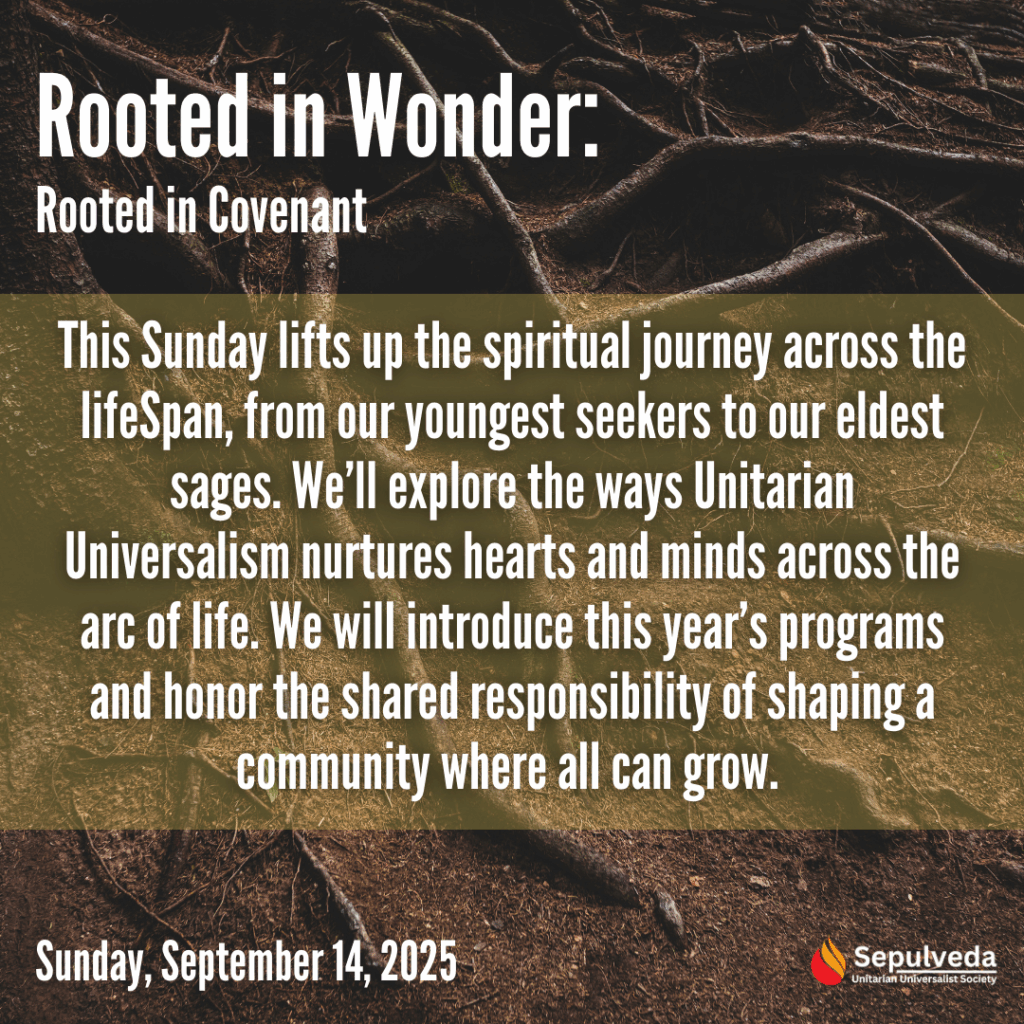 This Sunday lifts up the spiritual journey across the lifeSpan, from our youngest seekers to our eldest sages. We’ll explore the ways Unitarian Universalism nurtures hearts and minds across the arc of life. We will introduce this year’s programs and honor the shared responsibility of shaping a community where all can grow.