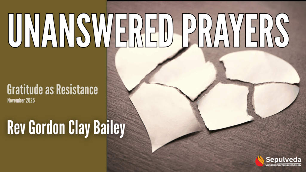 What does gratitude look like when our prayers seem to go unanswered? In the face of oppression, loss, or disappointment, how do we remain thankful for the gifts we do have – our relationships, our resilience, our rights hard-won? This service invites us into a practice of gratitude not as denial but as resistance, cultivating strength even in heartbreak.